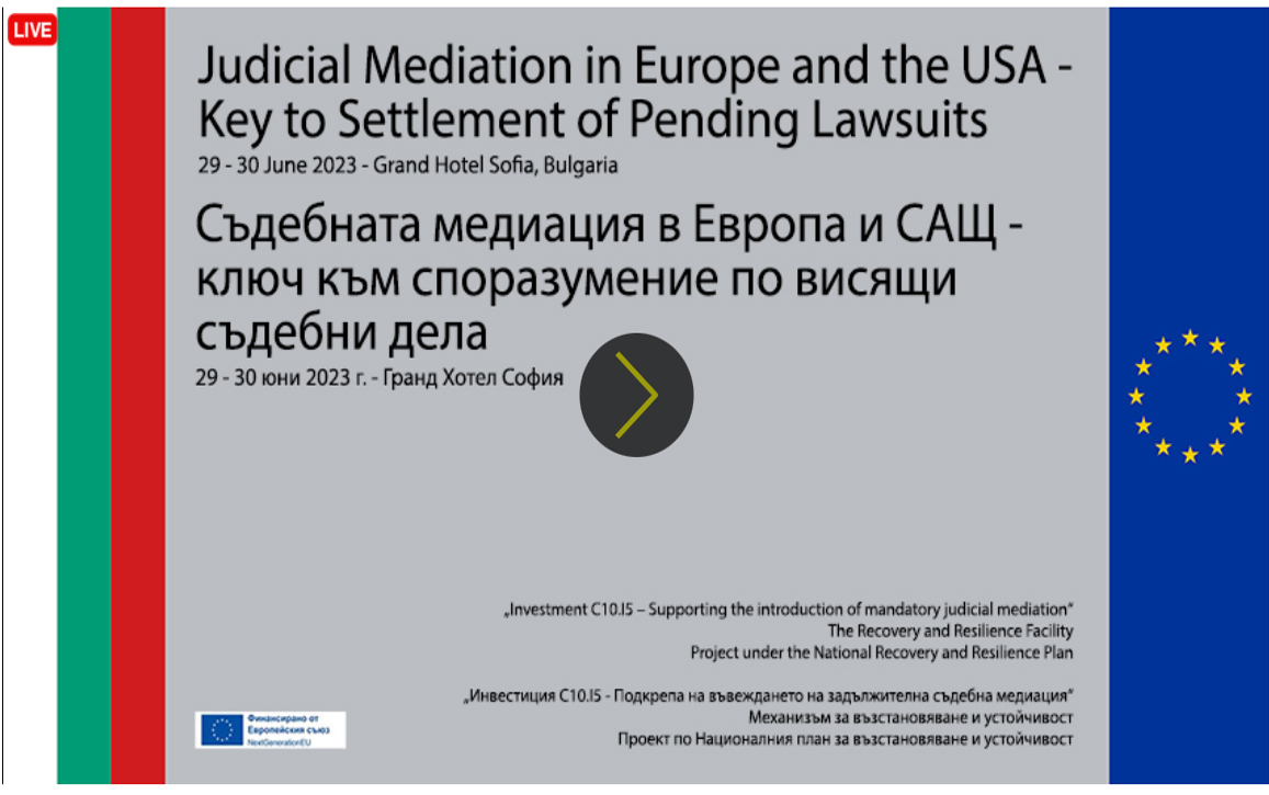 L’evento è stato realizzato dal gruppo di lavoro sul progetto “Sostegno all’introduzione della mediazione giudiziale obbligatoria”, presieduto dalla Dott.ssa Daniela Marcheva – componente del “Supreme Judicial Court of Bulgaria”, nell’ambito del Piano nazionale per la ripresa e la sostenibilità.